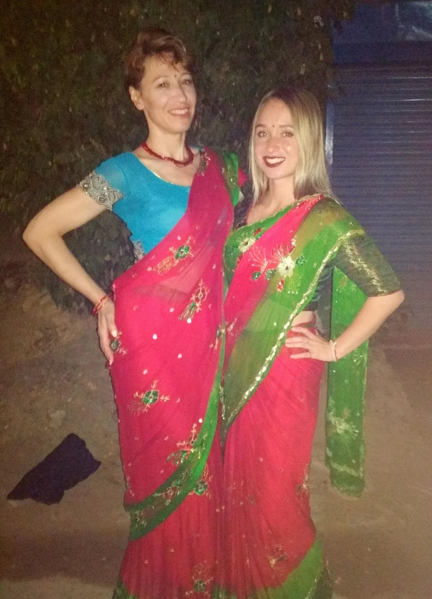 The hostess and her friend remove beautiful shiny sarees from the cabinets and start to rite us in them, all Indian jewelry from stock, our foreheads are red dots-bindi